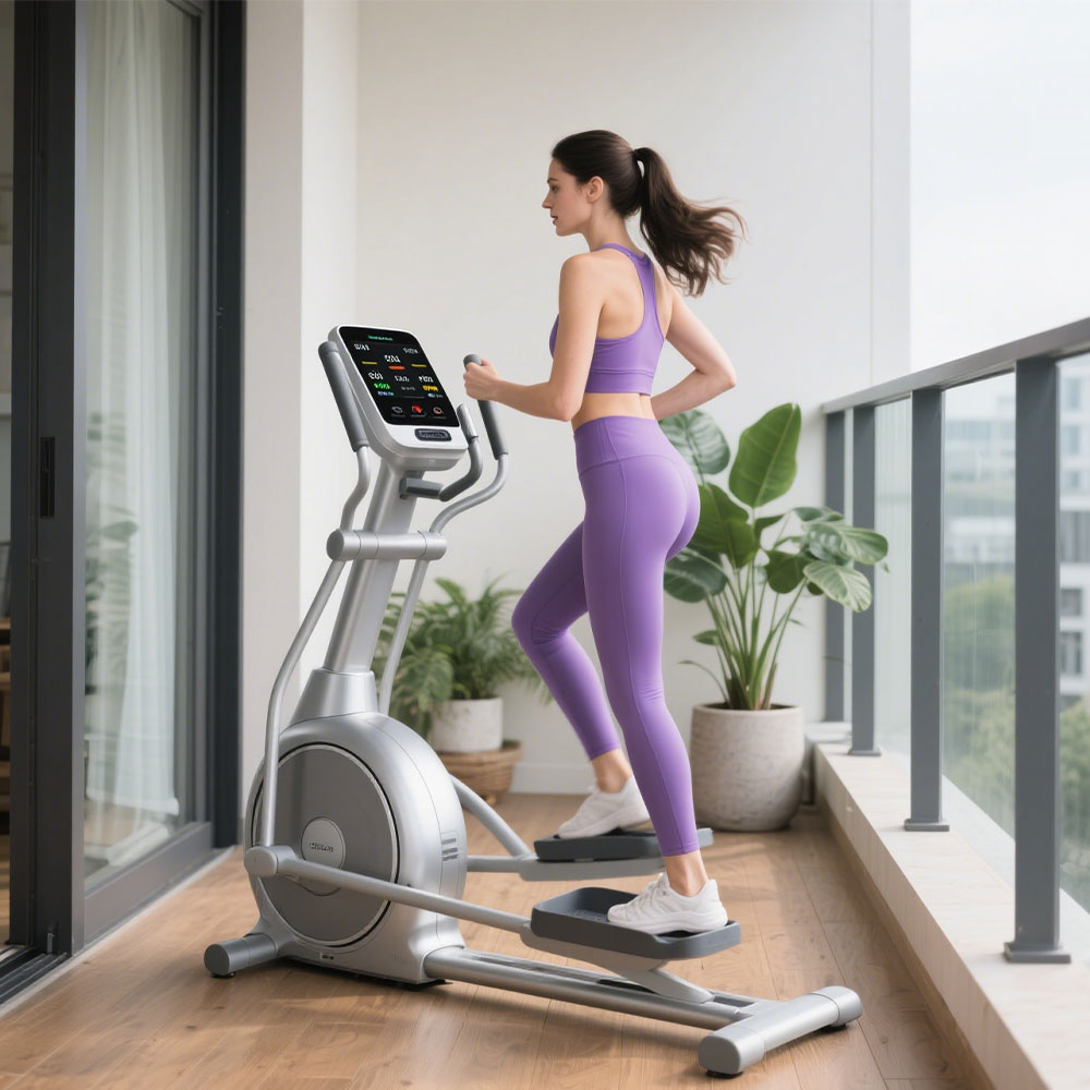 The Smart Elliptical Trainer is a modern fitness apparatus with a sleek silver – colored metal body and black non – slip pedals. It comes with a color smart display that presents real – time workout data. Ideal for low – impact, full – body workouts at home or in fitness facilities.